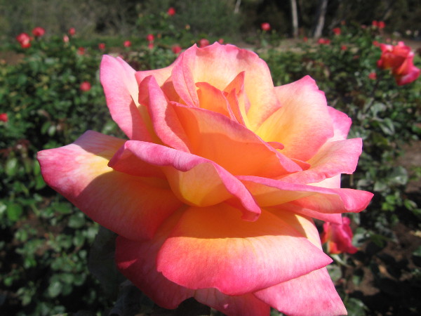 The Inez Grant Parker Memorial Rose Garden contains hundreds of brightly colored blooms!On a sunny Spring Sunday, a couple walks slowly through south part of beautiful Balboa Park rose garden, next to Park Boulevard.Strike It RichRainbow SorbetKoko LokoShockwaveSheila’s PerfumeLove SongGold Medal