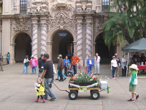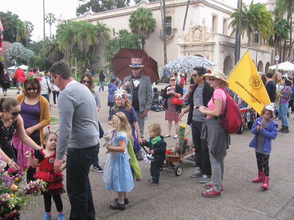 Many tents with horticulture exhibits were around Balboa Park for the Garden Party of the Century. Some can be seen next to the Botanical Building.These friendly folks explained that dahlia blooms can be as large as fourteen inches!Displays concerning gardening were front and center during the special Balboa Park Centennial event.These master gardeners showed me what a ladybird larva looks like! (It’s the critter on the right.)There were lots of flower arrangements and botany-themed art throughout the park!It’s still early in the morning, so some exhibitors are still setting up near the reflecting pool.This super cool lady talked to me about the work of the City of San Diego Environmental Services Department.Smiling lady from the San Diego Epiphyllum Society.Lots of plants were for sale in the park, including on the Casa del Prado patio.Ducks and baby ducklings were swimming about the lily pads in the Balboa Park reflecting pool!Sign shows the way to the Rose Garden across Park Boulevard.One example of Balboa Park’s Adopt-A-Plot volunteer gardening program. This plot is in Sefton Plaza.A photo I took this morning of beautiful flower beds in the Alcazar Garden.Another exhibitor near the huge Moreton Bay Fig Tree and Natural History Museum has a cool trash can painted with flowers and a bee.The Navy was showcasing its environmental programs.Marines cross street in front of the Casa del Prado Theater.The floral wagon parade was staged in a parking lot by the Balboa Park carousel.Musicians stand ready for the beginning of the big parade through Balboa Park.San Diego’s own Fern Street Circus has gathered for the parade holding colorful banners.Other performers from the Fern Street Circus wait a bit further down the parade route for the spectacle to begin.The Garden Party of the Century Parade is underway and turning onto El Prado!Kids, families, wagons and flowers. An overcast day after our recent stormy weather.Here come drummers and a flag down the festive parade route!Look at the boldly colored dresses and fantastic costumes!Here come some lush, wonderful floral wagons.Garden Party of the Century parade turns the corner and heads down El Prado toward Plaza de Panama.Flower-laden wagons pass in front of ornate Casa del Prado facade.A bee is followed by a beekeeper!The parade approaches the reflecting pool as it passes booths that line El Prado.This lady in an elegant old-fashioned dress was handing out goodies to the watching crowd.A painter in Balboa Park gets an eyeful as the parade passes by.Uncle Sam and lots of other happy San Diegans.Dr. Seuss seems to be a favorite author of the City of San Diego Park and Recreation Department!The cool parade finally reaches the spacious Plaza de Panama in front of the San Diego Museum of Art.A second parade nears! Marines from San Diego’s MCRD march down El Prado for a special ceremony.The band leads the way as marchers from the Marine Corps Recruit Depot enter Plaza de Panama.The Marines played an important role in Balboa Park’s beginning, and are duplicating their march from 100 years ago!Marines stand at attention. The San Diego mayor, MCRD commandant and other dignitaries spoke during the special Balboa Park Centennial event.Civilian and military bystanders look on as a memorable San Diego event is taking place.Proudly marching Marines head west down El Prado toward California Tower and Museum of Man.Marines start across the Cabrillo Bridge to reproduce a famous photograph from one hundred years ago!