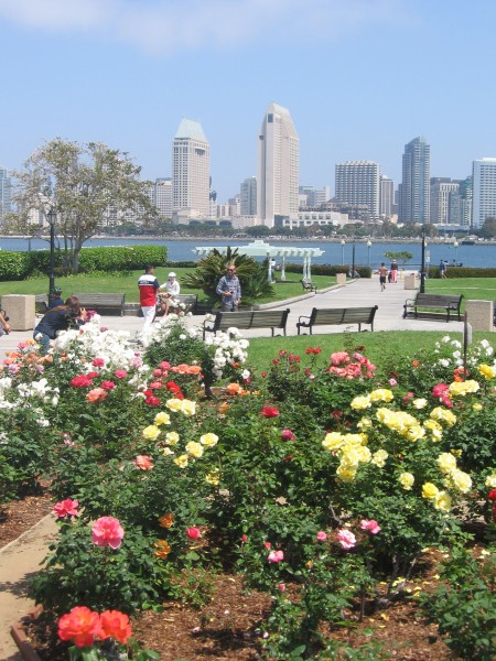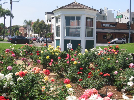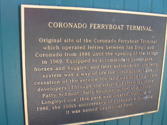 About a block north of today’s touristy Coronado Ferry Landing, you’ll find the old ticket booth of Coronado’s original ferry. It stands beside a garden full of colorful roses and a pleasant walkway that runs from the end of Orange Avenue east to San Diego Bay. This beautiful area is called Centennial Park.