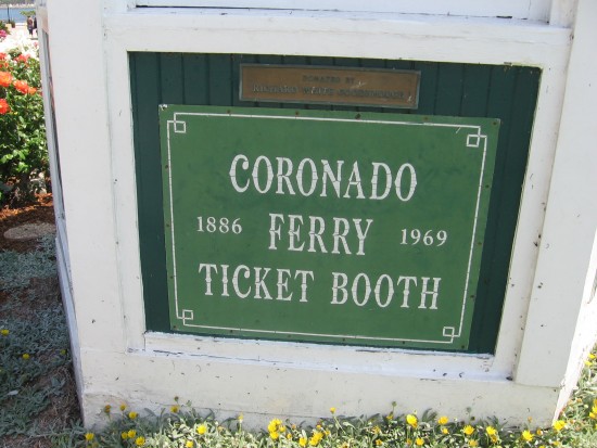 Looking over roses near the nostalgic old ticket booth.Sign reminds passersby of nearly a century of history.Plaque describes the history of the once vital Coronado ferry.Old Coronado ferry ticket booth surrounded by flowers.
