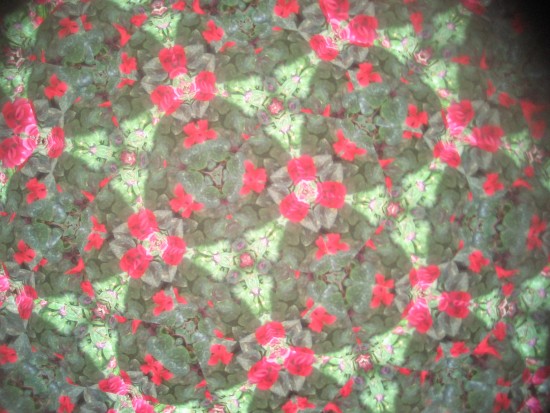 It’s a kaleidoscope mounted above a revolving bowl of flowers! Instead of turning the kaleidoscope tube, you whirl the bowl of blooms and watch different colorful patterns form through the lens. Several mirrors in the tube create the complex symmetry.
