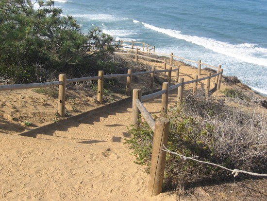 There are many hiking trails to explore in Torrey Pines State Reserve. Reaching this particular trailhead requires a short hike or drive from the entrance gate up steep Torrey Pines Park Road. As you head on up, you see numerous pine trees growing atop and clinging to eroded sandstone cliffs. These are the endangered Torrey pines (Pinus torreyana). They can only be found here and on the small island of Santa Rosa, off the coast of Santa Barbara. A good concentration of them can be seen on the Guy Fleming Trail.