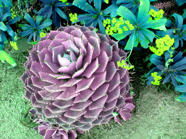 Contrast increased on photo of a spiky cactus.Some fat barrel cacti in a large desert-like garden in Balboa Park.A cool image I created by goofing around with various settings.This huge tangled cactus visible from Park Boulevard is the craziest thing I ever saw!Now I’m radically altering some pics.Cool silhouette in a popular Balboa Park cactus garden.I completely changed these colors just for fun!