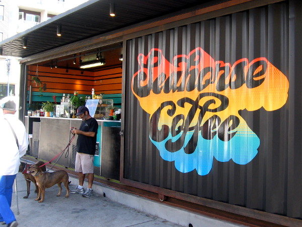 In addition to Burgers and Bites by the small live event stage, Quartyard features picnic tables and this outdoor bar.Colorfully painted utility boxes just outside Quartyard.This small fenced area in one corner of the container park Quartyard is perfect for dog lovers who live in the neighborhood.A beautiful mural by local artist Gloria Muriel just inside the entrance to Quartyard in East Village.A quick snack or drink can be purchased at the Seahorse Coffee shack out on the sidewalk.Look at the super friendly people you’ll meet!