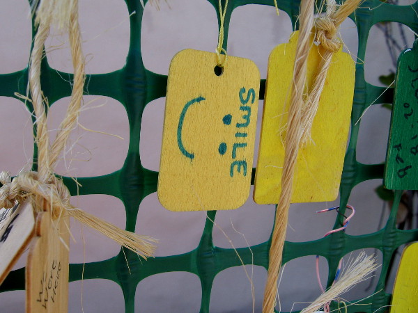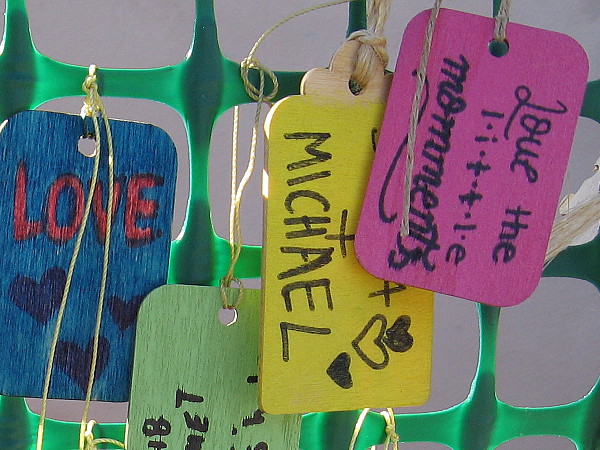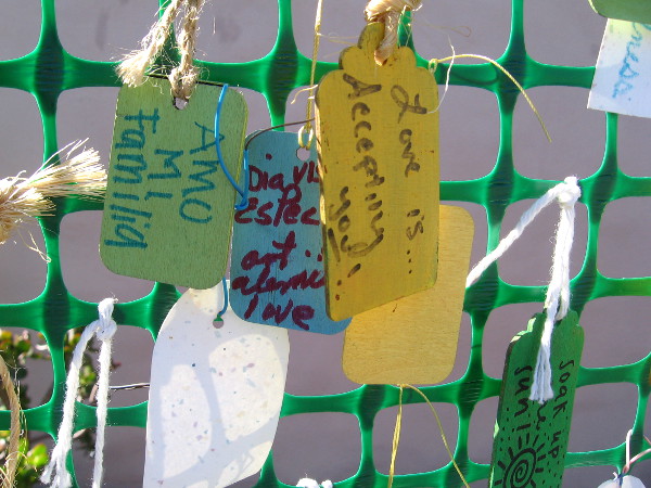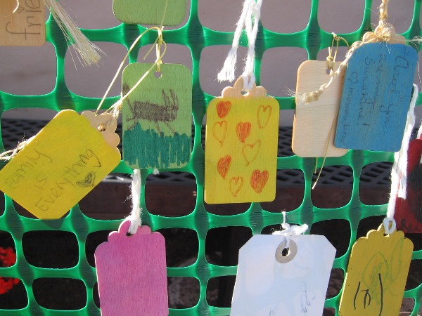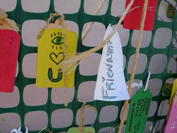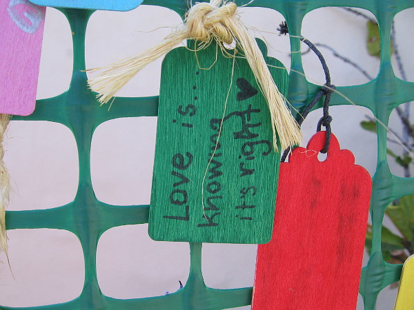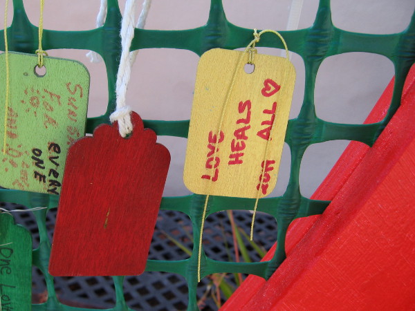 A heart-shaped Love Wall stands on the patio of the Spanish Village Art Center in Balboa Park.Many messages dangle from the Love Wall.Amo mi familia. Love is accepting you.Smile.Love heals all.Love one another. Kindness ripples.Family is everything.Love is . . . knowing it’s right.Many messages of love from many different hands, young and old.I love you. Friendship.