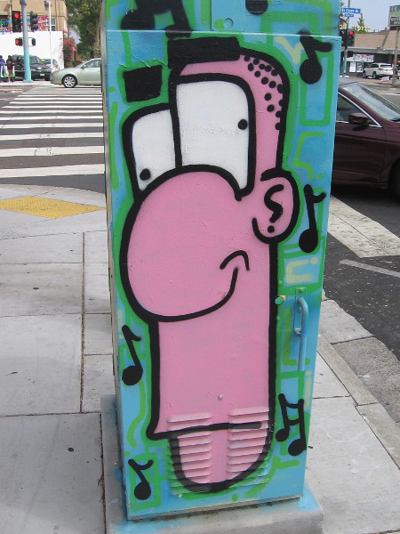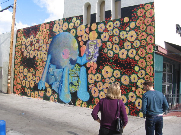 The other day, while shuffling along what seemed to be an unremarkable sidewalk in downtown San Diego, my legs were suddenly arrested and my eyes transfixed by this awesome street art. A fun-loving, imaginative artist did a great job of enlivening this construction site fence, which can be found on 8th Avenue just north of Market Street.