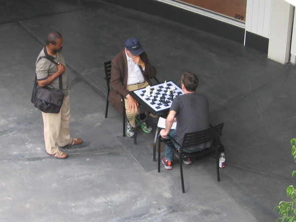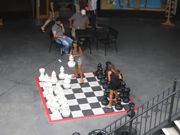 Here are three fun photos! I stood for a moment on an upper level at Horton Plaza, watching two guys play a game with giant chess pieces.