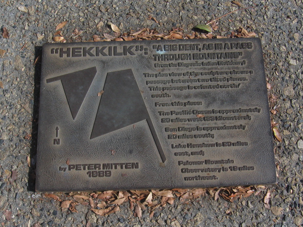 Tilted concrete slabs, like geometric planes, form a narrow passage. The title of the sculpture is Hekkilk, and it was created by Peter Mitten in 1989. According to a nearby plaque, Hekkilk is a Diegueño Indian word that means “a big dent, as in a pass through mountains.”