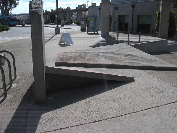 Unusual public art stands in the middle of the Escondido Transit Center. The abstract concrete sculpture is surrounded by North County Transit District bus stops.