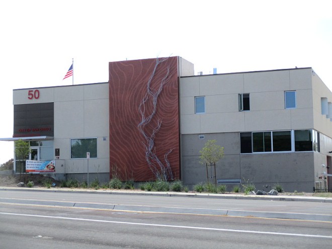 The huge metal sculpture on the building’s side represents “blue” Rose Creek running through “coppery” Rose Canyon, which the fire station is positioned above!