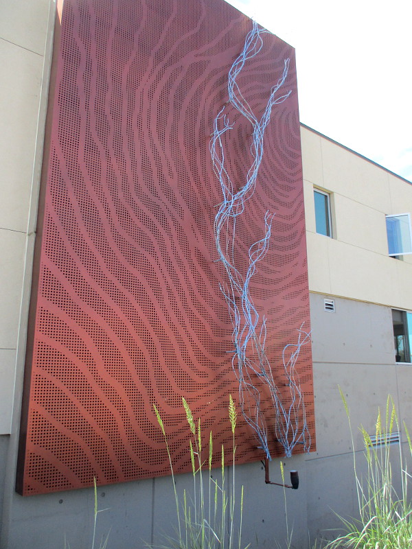 At first sight I thought the bluish wire-like tubes that compose the river represent smoke! Or perhaps the tall grass by the sidewalk! But, no. The vertically arranged river runs across perforated copper layers that intentionally appear like a topographic map–the type of map firefighters often use.
