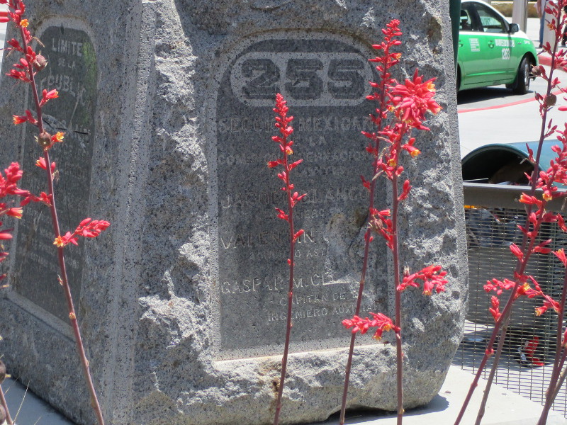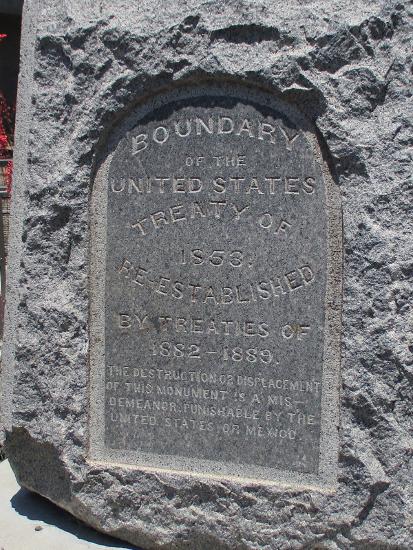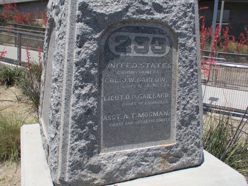 A granite monument, marker number 255, reads Boundary of the United States–Treaty of 1853–Re-Established by Treaties of 1882-1889. The opposite side contains the same information in Spanish. The monument’s two other sides show the principal names from the international commission that precisely determined the previously disputed boundary with Mexico in 1892 to 1896. It was one of 258 markers placed along 689 miles of border.