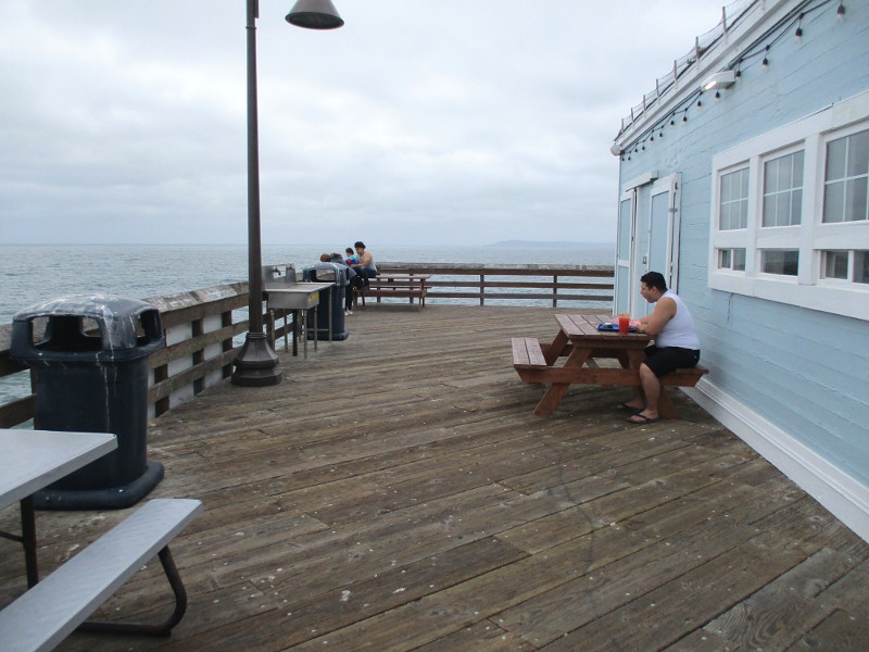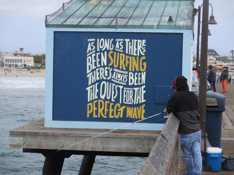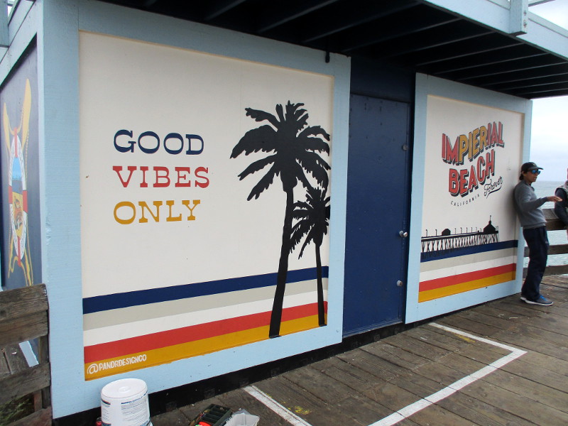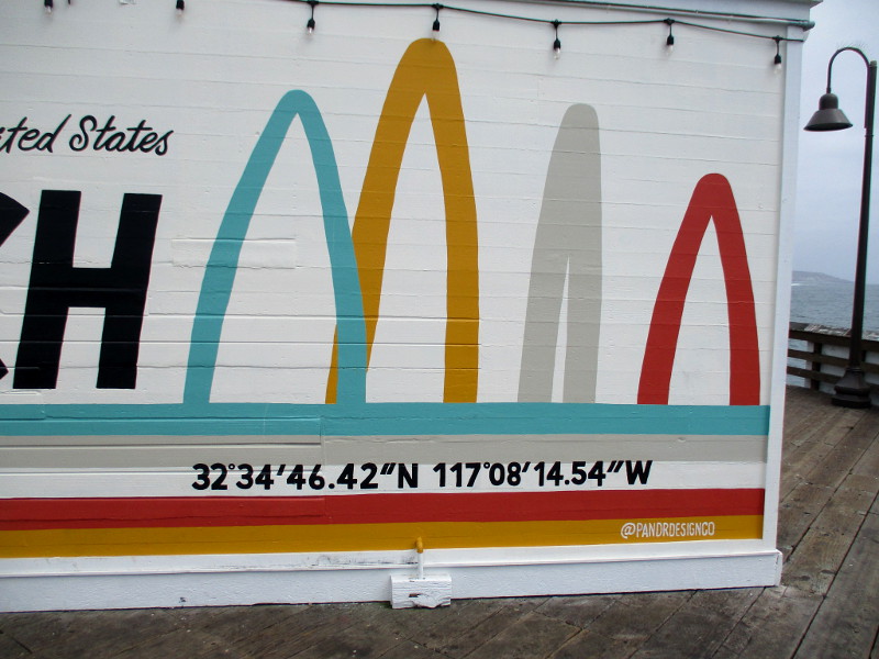 And if you turn around at the end of the pier to look at one side of the Tin Fish restaurant, you’ll see a big mural created late last year by the local artists of Pandr Design Co. The mural includes geographic coordinates in degrees of latitude and longitude that prove its assertion!