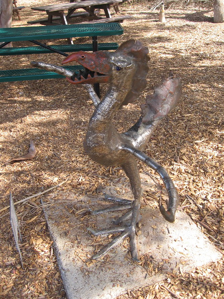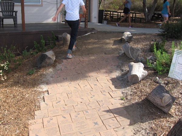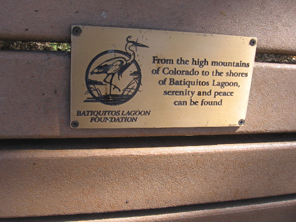 The two mile trail along the north edge of the tidal wetland and the Nature Center are both maintained by the Batiquitos Lagoon Foundation.A hiker approaches the Batiquitos Lagoon Nature Center from the Gabbiano Lane trailhead.Curious visitors come and go, keeping friendly volunteers at the Nature Center busy.People can purchase a personalized brick to help support the Batiquitos Lagoon Foundation.The Nature Center might be modest, but it is welcoming and full of interesting exhibits.Before entering I saw the Batiquitos Free Lagoon Lovers Library.The very cool Batiquitos Lagoon Nature Center is like a one room jam-packed museum.I see a snowy egret and a Cooper’s hawk.The many different birds that live at the lagoon can be identified by their distinctive eggs.Visitors can closely examine lagoon insects and other creeping, crawling creatures.Various human artifacts on display include Native American Kumeyaay clay pots and tools.A poster shows Carlsbad’s watershed, including the area where fresh water (including San Marcos Creek and Encinitas Creek) flows into Batiquitos Lagoon.As I left the Nature Center, I lingered for a moment on the shady front porch and gazed out toward the nearby lagoon.Next to some picnic benches by the Nature Center, you’ll find a very strange creature lurking. It’s The Creature From Batiquitos Lagoon, by artist Paul Weber, 2003.To the west, Interstate 5 runs over part of the lagoon’s Pacific Ocean tidal inlet. Many drive past this beautiful place without ever stopping to enjoy it.Now we are heading east along the north edge of smooth, blue Batiquitos Lagoon.Several small concrete seats were decorated with colored stone mosaics. This one features a mallard duck.The bright September sunshine on green.The west part of the Lagoon Trail follows tan sandstone cliffs.The cliffs along this stretch belong to the Scripps Formation. The sandstone was deposited in a shallow ocean about 45 million years ago.Approaching a more wooded area at the border of the lagoon.Several short trails head north from the main trail into nearby Carlsbad neighborhoods.I see a mosaic turtle!Many informative signs can be found along the trail. This one lists salt marsh niches, including floating plants, diving birds, wading birds, bottom fish, mud worms and more. It also talks about caring for the environment and human responsibility.A large mudflat shines like silver in the morning sunlight.This enormous tree stands alone near the edge of the water. It has probably lived there for a very long time.Now I see a wading heron!Walking near the lush edge of the tidal marsh. Along here grows a lot of Coyote Brush, and non-native Yellow Mustard.The trail passes over a tiny bridge and a thin stream of water.Bending over I was able to take a photograph of a wood rat den made of twigs and branches.A nearby sign explains the wood rat’s den. Also called pack rats, they build complex houses with various chambers.The white fluffy heads of some non-native pampas grass seem to shimmer in the breeze.Now we are walking right beside the tidal lagoon.Coastal Goldenbush blooms about to open.More beautiful leaves in sunlight.It appears a tall tree fell and was cleared from the path.Walking along a very beautiful trail in coastal San Diego County.Plaque on one bench by the trail. From the high mountains of Colorado to the shores of Batiquitos Lagoon, serenity and peace can be found.More natural beauty.We are near the end of our two mile walk.More late summer beauty.Now we are approaching the eastern end of Batiquitos Lagoon, beyond which runs El Camino Real. Light shines upon life-giving water.