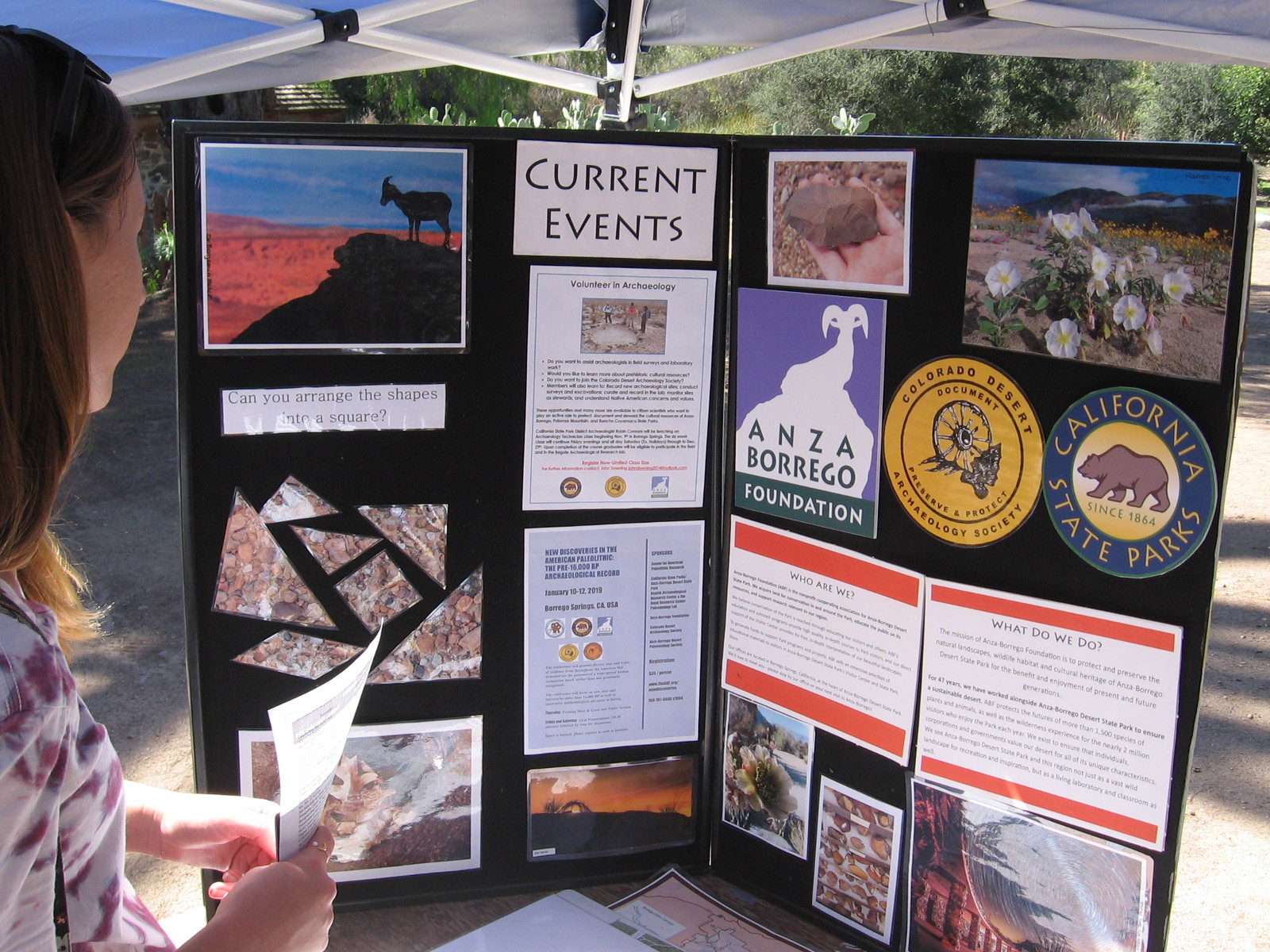 Visitors check out displays by colleges, businesses and organizations concerning the region’s archaeology, anthropology and natural environment.People learn to how to weave baskets, an essential skill of the region’s Native American Kumeyaay people.A poster shows California State Parks Southern Service Center’s various Archaeological Projects 2017-2018.Another California State Parks display shows interns at work sorting and identifying material from excavations in Southern California.This curious dog was more interested in learning about archaeology than that nearby bobcat.A display contains info regarding the Anza Borrego Foundation and the Colorado Desert Archaeology Society.Members of the Colorado Desert Archaeology Society can volunteer and become citizen scientists at Anza Borrego, Palomar Mountain and Rancho Cuyamaca State Parks!Rock samples from different geological formations in Penasquitos Canyon.Guinevere, the Merlin Falcon, is an animal ambassador for the San Diego Humane Society. (She had a wing injury and can’t fly properly.)At Red Tail Environmental’s table, kids could create sand art based on a ground painting by Native Americans at Mesa Grande.Chambers Group had an interesting poster concerning fossil mastodons and whales.Kumeyaay artifacts were displayed on the SDSU Department of Anthropology’s table. (If you’re a teacher, it might interest you that they offer free classroom presentations.)Enjoying a sunny San Diego day at Arch In The Park, presented each year by the San Diego County Archaeological Society.The Forest Fire Lookout Association had a cool display of all the Lookouts of Southern California.When smoke is spotted from a fire lookout, this simple device is used. Visually lining up the sighting determines the fire’s direction, or azimuth.Cleveland National Forest had a big display, too. They also love volunteers.Some photos from the Laguna Mountain Recreation Area, one of my favorite places.Some artifacts on display created by Native Americans from San Luis Rey. Two of the baskets (near the top of this photo) were made in the 1800s.A friendly student at this table talked to visitors about the California State University San Marcos Anthropology Club.As I headed over to a field where real archaeological digs can be seen, I was passed by people on horseback, enjoying their day at Los Peñasquitos Canyon Preserve.Excavations at Los Peñasquitos Canyon Preserve are carried out by students in the Archaeology Program at Palomar College.I learned the Kumeyaay in this region obtained obsidian for projectile points by trading with other native people who lived to the east, by the Salton Sea. Ancient arrowheads and other mysterious objects are sometimes unearthed in this area.A field east of the Los Peñasquitos Ranch House where archaeology students search for clues about the historic and prehistoric past.Walls and drainage structures poke out from the field. Their exact story is a puzzle that will eventually be pieced together.A part of a torn down barn’s foundation has been discovered here. Small, interesting finds are collected by general type in a cupcake pan!Tunneling gophers make reconstructing the past more difficult. They move materials about as they dig.Nearby I saw several devices used for wet screening excavated soil, a process that follows dry screening.Smokey Bear must also be an archaeology enthusiast! I spotted him checking out debris left on the ground in another corner of the field, the area used for dry screening excavated soil!