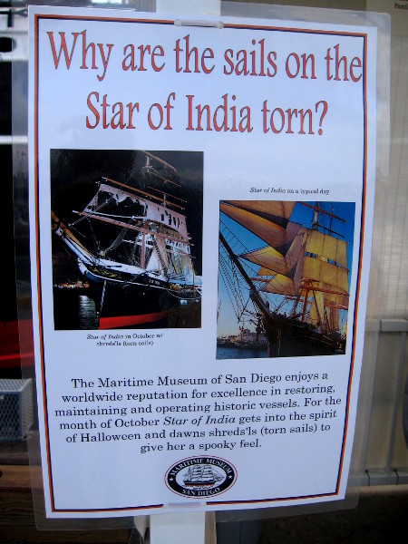 Morning pic of a sail in shreds for Halloween-themed Star of India.Torn sails befit the spooky Halloween spirit.October sign on historic tall ship reads Haunted Tales on the Star of India.
