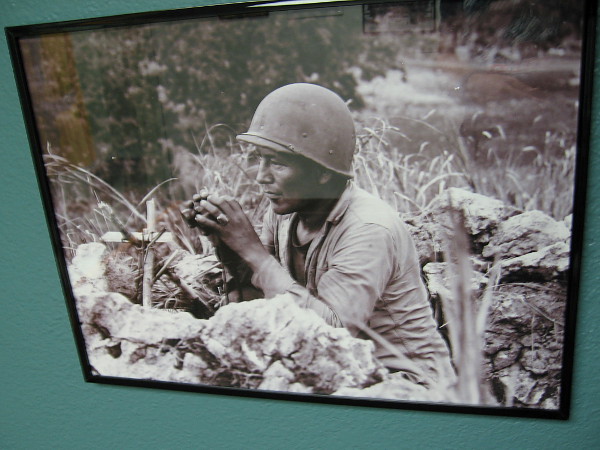 A small but fascinating exhibit remembering the Navajo Code Talkers of World War II is currently on display at the Flying Leatherneck Aviation Museum in San Diego. The exhibition, titled CELEBRATING 75 YEARS – CODE TALKERS: THE NAVAJO WEAPON, contains photos, documents, uniforms and historical artifacts that describe how the Navajo language was used to develop a code for secret tactical communication in the Pacific, in places like Iwo Jima and Okinawa. The Navajo code, which was classified until 1968, is the only spoken military code that was never deciphered.