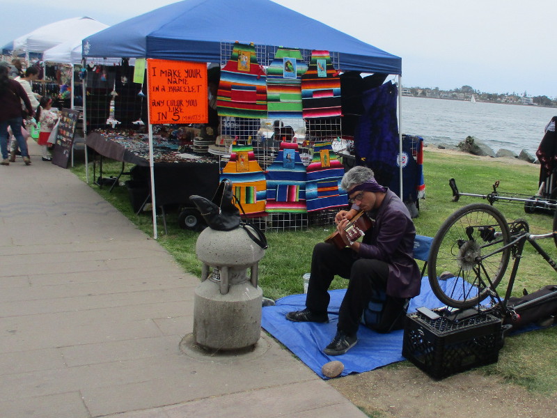 Street performers and vendors were stationed along the boardwalk. Kites were flying at Embarcadero Marina Park North. People were eating lunch outdoors.