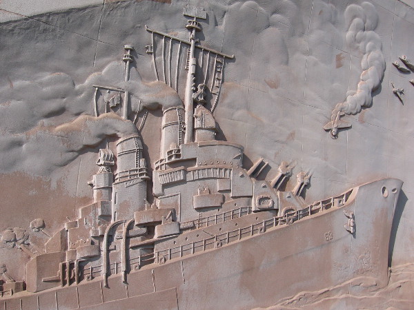 Monumental art remembers a famous World War II ship.The names of those who served on USS San Diego.Terrazzo map shows movements of the ship during the war.The light cruiser is depicted in action beneath an aerial fight.