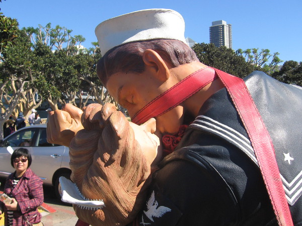 This morning a special Spirit of ’45 wreath laying ceremony was held on San Diego’s Embarcadero, right next to the USS Midway Museum. The area is known as the Greatest Generation Walk, and is dotted with monuments and memorials remembering those who fought in World War II. Today’s event took place at the heels of the large Unconditional Surrender statue, created by artist Seward Johnson. The sculpture was modeled after the iconic photograph of a sailor spontaneously kissing a nurse in New York City’s Times Square upon learning the war was over. How appropriate!