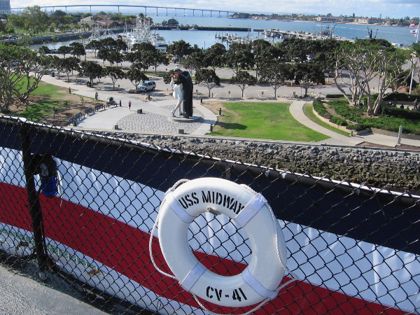 People cross flight deck of USS Midway aircraft carrier museum to attend a special Memorial Day weekend event. (Chairs are for a Wynonna Judd concert later this evening.)Looking south over San Diego Bay from upper deck of USS Midway Museum. Unconditional Surrender statue can be seen below.Pomerado Community Band plays music before start of short ceremony that honors World War II veterans.God Bless America sung with a deep, resonant voice. Many in the crowd listen with emotion.Guests are ready for the special Memorial Day weekend Veterans Wreath Ceremony to begin.There are two wreaths. One commemorates those who fought in the World War II Pacific theater. The second wreath is dedicated to those who served in Europe.This honored vet performed his duty in the Pacific during the Second World War. With him are two other generations.Also honored was energetic Stu Hedley, who is a Pearl Harbor survivor.Vintage World War II P-35 fighter aircraft from Air Group One (San Diego Wing of the Commemorative Air Force) flies over during the ceremony.The wreaths are presented to the two representative veterans, who will toss them into the water.In a time-honored ritual and tribute, the first wreath takes flight as many watch and The Remembrance Bell is rung.Flowers and memories float on San Diego Bay on this beautiful Memorial Day weekend.A photo from the flight deck of the USS Midway. The historic aircraft carrier is used for many military ceremonies in San Diego.