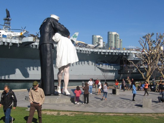 A temporary Unconditional Surrender statue was originally placed at this site, but it was replaced with a permanent bronze version in 2012. Unlike most other monuments and memorials located on the Greatest Generation Walk, just south of the USS Midway, this statue is so enormous it can be glimpsed from several points on San Diego Bay.