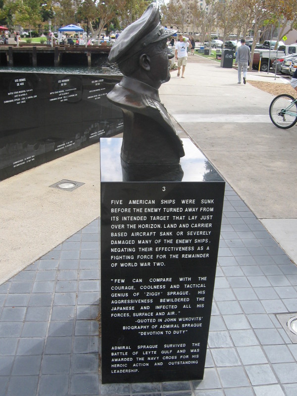 This is the bust of Vice Admiral Clifton Sprague. He commanded Task Unit 77.4.3, also known as Taffy 3, during World War II. The 13 ships and over 7000 men of Taffy 3 fought courageously in the Pacific, repulsing a vastly superior force of Japanese battleships, cruisers and destroyers in the Battle of Leyte Gulf. It was the war’s final and greatest battle between the two opposing fleets.