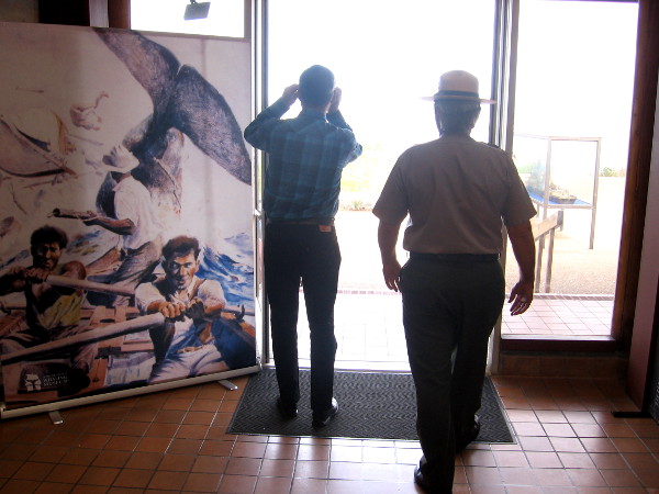 After listening to a short opening presentation by Park Superintendent Tom Workman and Christina Connett, PhD, Curator of Collections and Exhibitions at the New Bedford Whaling Museum, I headed out to Cabrillo’s excellent Pacific Ocean viewing areas to scan the horizon for spouts. I didn’t see any, but there were a bunch of boats off Point Loma whale-watching on this sunny Sunday afternoon. I got more pics from my visit coming, so stay tuned!