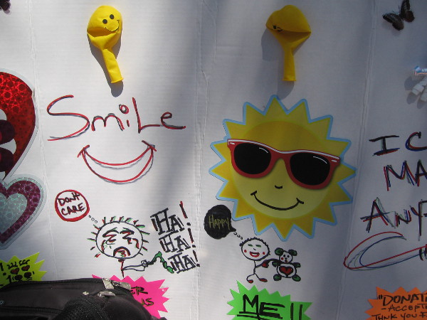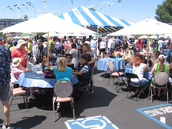 A couple has front row seats to a lot of colorful kite action at Robb Field in OB.Young and old participated in this very cool event.Among a variety of festival participants were some clever vendors who conveniently sold kites!Materials at a kite creation and repair station include markers to add color to new kites.I saw some four-legged friends on the grass.The event was sponsored by the Kiwanis Club of Ocean Beach and the Ocean Beach Recreation Center. The Point Loma Kiwanis Club also participated. They distribute cookies to the troops as a comfort and thank you.Bubbles mix well with kites.This guy has a cool U.S. Navy Blue Angels kite!Any day blessed with a breath of wind, even a cloudy one, is a perfect day to go fly a kite!