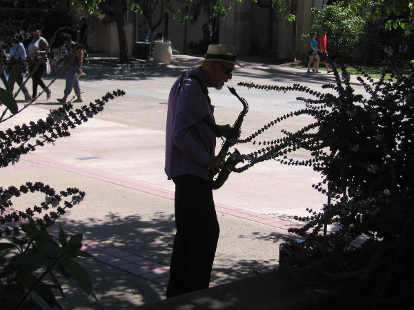 A street musician smiles on a beautiful Labor Day in Balboa Park.