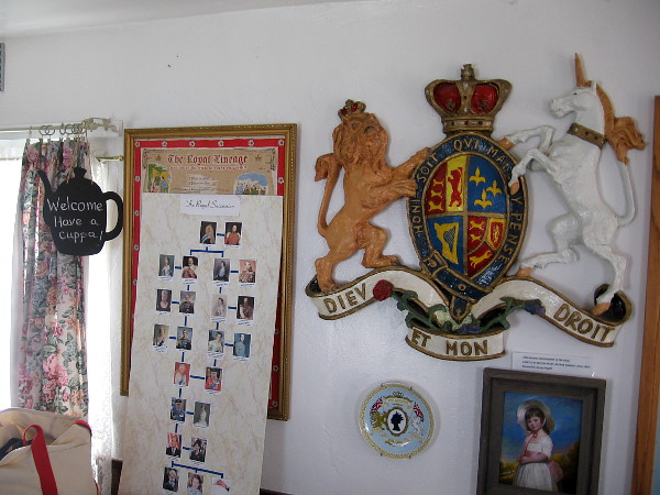 One wall features the Coat of Arms of the United Kingdom. A nearby poster traces The Royal Lineage.