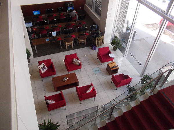 Looking down at the commons lounge area and the adjacent computer center.