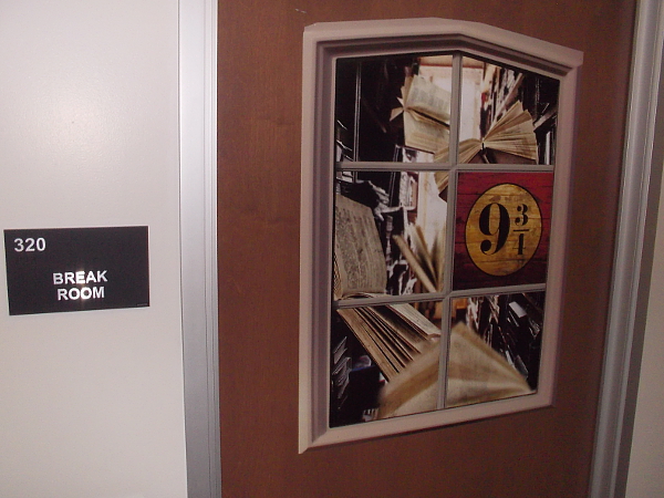 What’s that I see on the break room door? Are those flying books? Does this doorway lead to Platform 9 3/4?