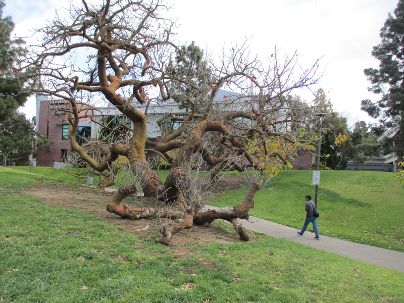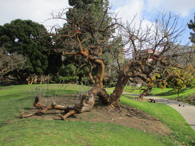 I was walking up Park Boulevard this morning, on my way from downtown San Diego to the Comic-Con Museum in Balboa Park, when I spied the fantastically twisted tree. A few of its gnarled. outstretched limbs had slammed against the nearby grass, sadly crushing goodness knows what.