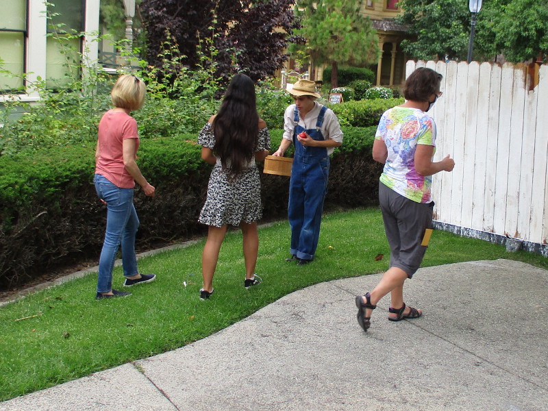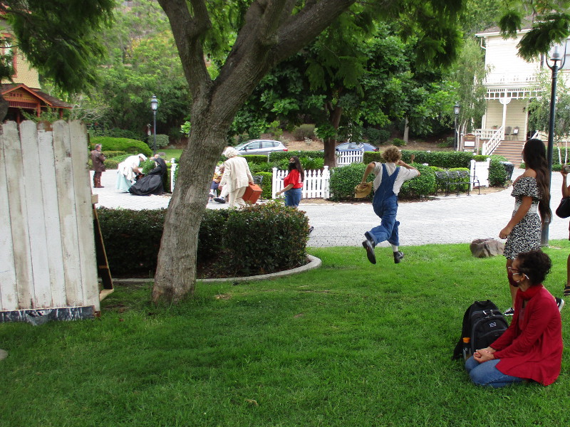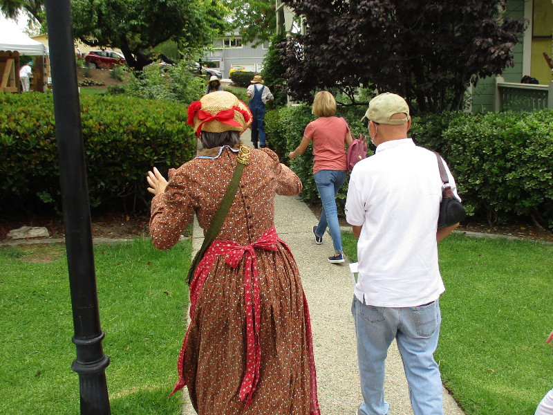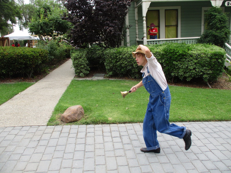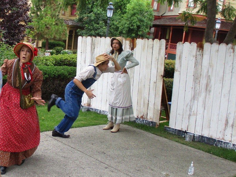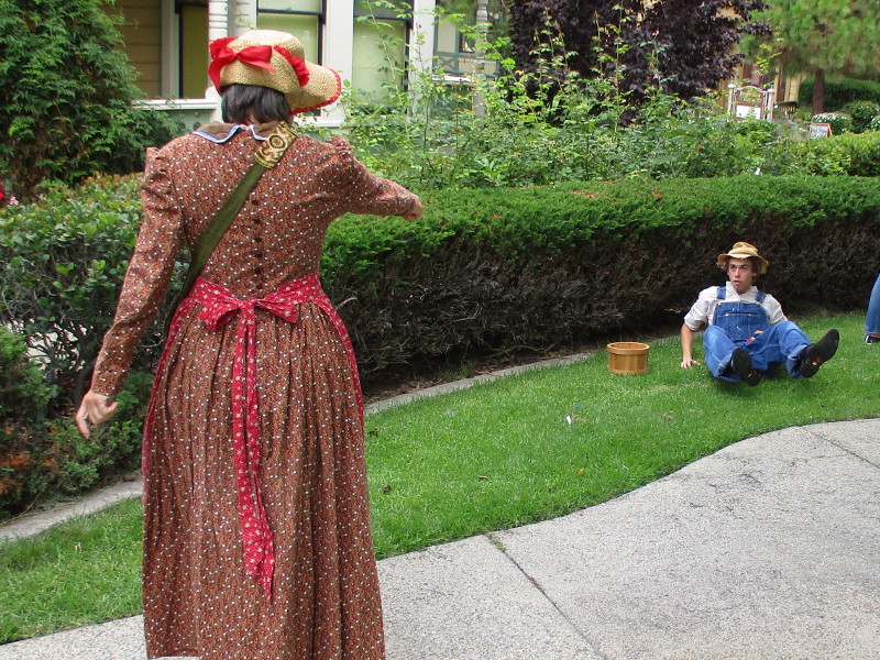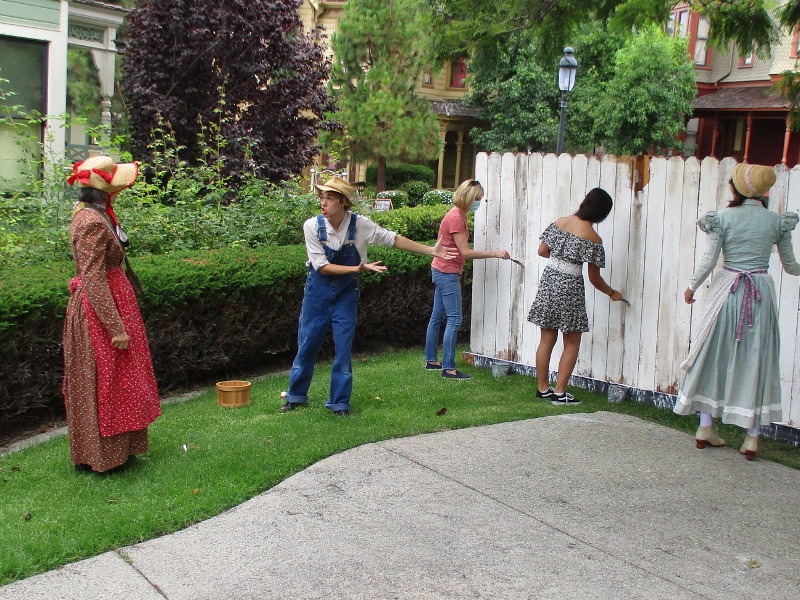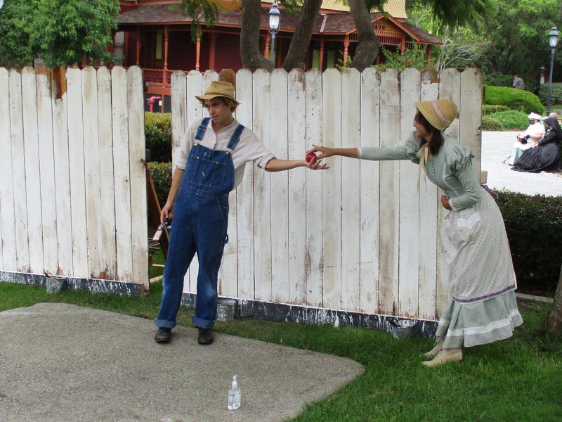 Did Tom Sawyer steal the school bell? Why the hurry? It appears Mark Twain’s beloved character is playing hooky, running through Heritage Park during TwainFest.Uh, oh! Aunt Polly has spotted Tom and is giving chase!Tom tries to hide behind a fence, but Aunt Polly is familiar with his antics and quickly finds him.Aunt Polly tells that mischievous boy Tom he has a chore to do. He must whitewash the fence!He surveyed the fence, and all gladness left him and a deep melancholy settled down upon his spirit. Thirty yards of board fence nine feet high. Life to him seemed hollow, and existence but a burden. –Mark Twain from The Adventures of Tom Sawyer.Here comes Becky Thatcher, looking for Tom.Becky observes poor suffering Tom Sawyer whitewashing the fence.Tom explains to Becky that it isn’t every day a person gets to whitewash a fence. In fact, it’s quite a privilege.Becky Thatcher gives Tom a whole apple for this rare opportunity to whitewash the fence!Several visitors to TwainFest are lured into Tom Sawyer’s scheme. They happen to find small objects on the grass nearby, and offer them to Tom so that they, too, might whitewash that fence!Tom’s basket fills with contributions.The TwainFest visitors and Becky get to work while Tom takes another bite from his apple.Whitewashing the fence is such fun!Tom Sawyer lies back with his apple and enjoys the fruits of his trickery.Here comes Aunt Polly! Uh, oh! She’s searching for Tom!Tom Sawyer’s in big trouble…again!Tom does his best to explain this rather unusual situation, but Aunt Polly has heard it all. She isn’t easily fooled.Tom shouts and points his finger into the distance, causing Aunt Polly to turn in surprise. That clever Tom Sawyer takes full advantage of his distraction! Run!Tom Sawyer makes his escape!