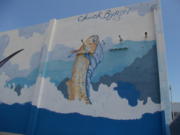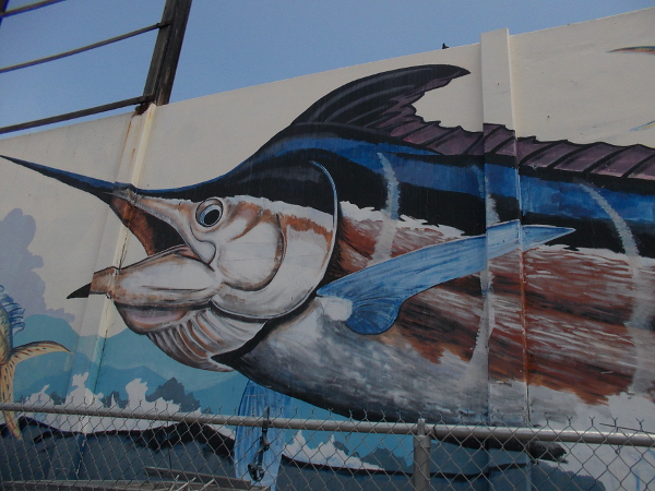 Drive along Interstate 5 between Mission Bay and Bay Park and you’ll see a huge sportfishing mural. It’s just north of Tecolote Road. Across the west side of the Kleege Industries building, a pair of enormous marlins chase leaping dorados!