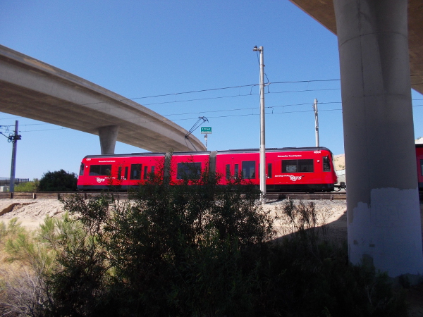 Yesterday morning I jumped off the Green Line trolley at the Rio Vista station. I walked east over Qualcomm Way via the pedestrian bridge then continued down the little-used walkway that runs parallel to the trolley tracks.