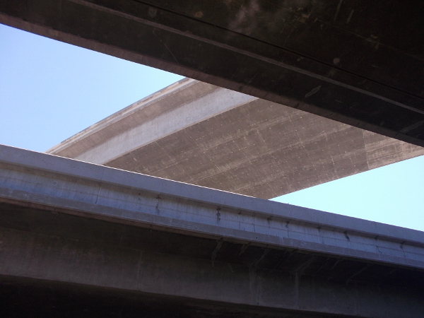 The concrete walkway leads behind the Marriott Mission Valley and several large, gleaming office buildings and finally terminates by a parking lot directly beneath the very impressive I-805 freeway bridge.