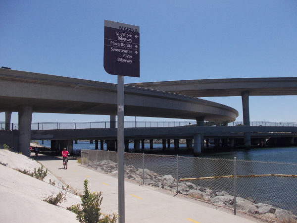 I’m back by the water’s edge. A sign at the intersection of the Bayshore Bikeway and Sweetwater River Bikeway.