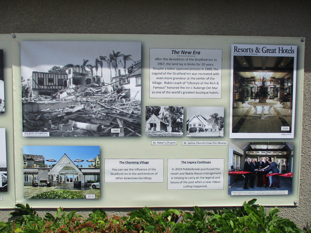 Pedestrians coming down the sidewalk have the opportunity to rest and view photos from Del Mar’s past in this quiet nook near L’Auberge Del Mar, across 15th Street from Stratford Square’s distinctive Tudor style building.