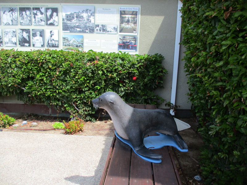 The history of Del Mar begins in 1885 with the new California Southern Railroad, connecting Los Angeles to San Diego. The first hotel, opened in 1886, was Casa Del Mar. The Natatorium at the end of 10th and 11th Street featured a dance pavilion on the beach and a large saltwater swimming pool.A 1000 foot pier was built in 1912 near the end of 15th Street. When it became too damaged by the passage of time and many storms, it was demolished in 1959 by the Navy’s Underwater Demolition Team!The Hotel Del Mar (originally called the Stratford Inn) attracted the rich and famous after Bing Crosby built the Del Mar Racetrack in 1937. Parties featured entertainers such as Bob Hope, Al Jolson and Danny Thomas. Frequent guests included Buster Keaton, Mickey Rooney, Betty Grable, Lucille Ball, Jimmy Durante and many others.Photos of celebrities at the Del Mar Racetrack, including Ava Gardner, Ronald Reagan, J. Edgar Hoover, Cary Grant and Red Skelton.The Stratford Inn opened in 1909 and attracted Hollywood’s silent film stars. It was finally demolished in 1967. The posh L’Auberge Del Mar, which stands on the site now, was featured on Lifestyles of the Rich and Famous.This is Sally the Sea Lion!