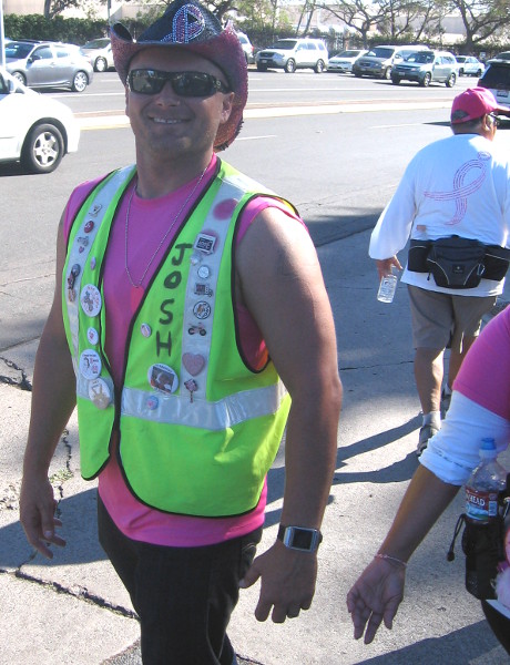 San Diego walkers cheered by pink-wearing supporters on Park Boulevard.Mile 59. Just one mile to go to the Petco Park finish!Lots of fun pink stuff greeted the walkers along their route.Guy helping with traffic wears pink and lots of pins and buttons.Encouraging signs were everywhere along this beautiful section of the San Diego route.Someone stenciled LOVE on the sidewalk.Hydration station awaits some oncoming anti-breast cancer walkers.Cars coming down the street honked and featured optimistic messages.San Diego police officer wears pink for the special occasion.Someone wrote a personal encouraging note in chalk on the sidewalk.This cool bystander guy has a pink mohawk!U GO GIRL
