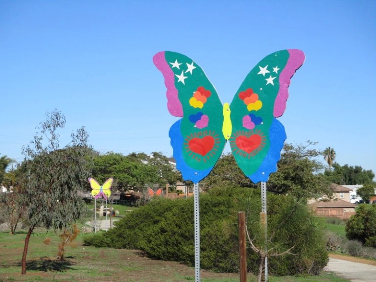 Riders can glimpse the beautiful artwork from the San Diego Trolley’s Blue Line, just south of where the tracks pass under Interstate 5. The mural is in a corner of a parking lot near the intersection of Wilson Avenue and Civic Center Drive.