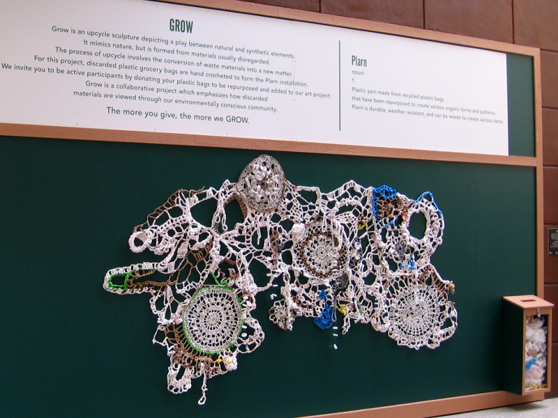 Grow is an upcycle sculpture depicting a play between natural and synthetic elements. For this project, discarded plastic grocery bags were hand crocheted to form the plarn installation.Plarn is plastic yarn made from recycled plastic bags. It is durable, weather resistant, and can be woven to create various items.The artist Cat Chiu Phillips utilizes found materials and creates displaced juxtapositions. She includes unusual mediums such as recycled objects.Work of art, titled Grow, can be examined up close by visitors and shoppers walking through the Horton Plaza mall.A box by the fantastic plarn sculpture invites passersby to recycle their plastic shopping bags.