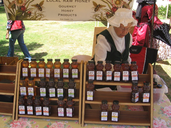 This nice lady in a bonnet was selling honey produced in San Diego.