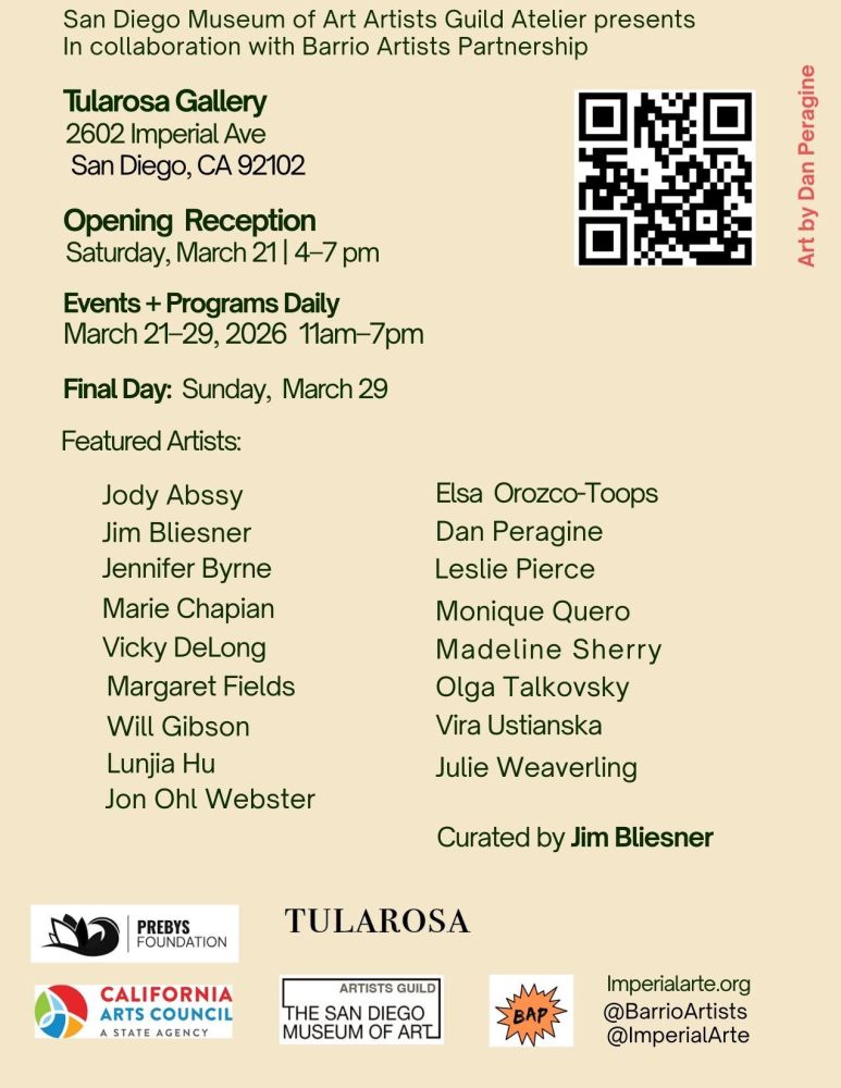 A special art exhibition will soon be opening in Grant Hill, across Imperial Avenue from neighboring Logan Heights. One Day in the Life on Imperial will feature works by members of the San Diego Museum of Art Artists Guild. The exhibition will be open to the public beginning March 21, 2026 at the TULAROSA gallery, located at 2602 Imperial Avenue. The Opening Reception is from 4 to 7 pm.