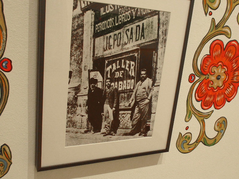 Photograph of Posada’s Workshop, with Posada on the right.Museum visitor views works of political art inspired by Posada.