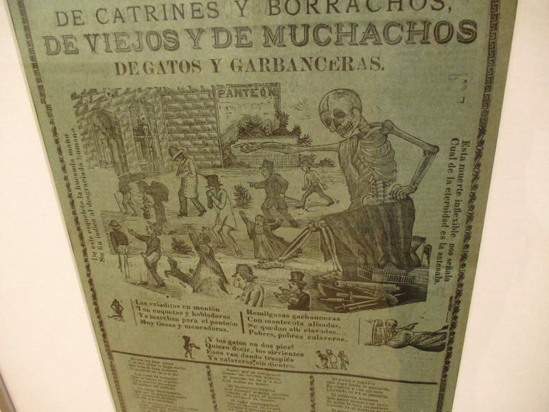 Undoubtedly you recognize the image in the above photograph. It is Posada’s iconic La Calavera Catrina, a 1910–1913 zinc etching that was later popularized by Mexican painter Diego Rivera. Today La Calavera Catrina is a common sight during Day of the Dead.