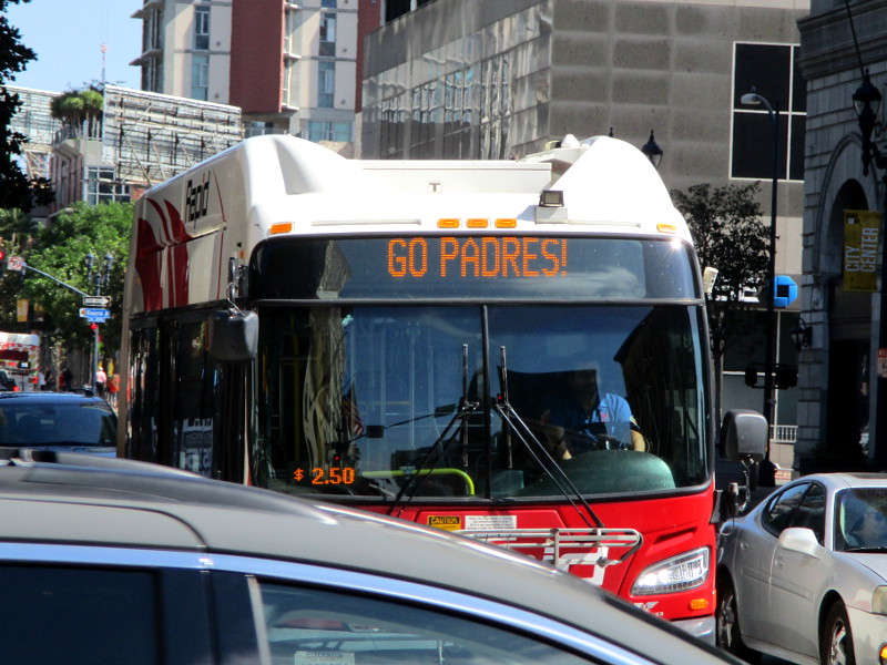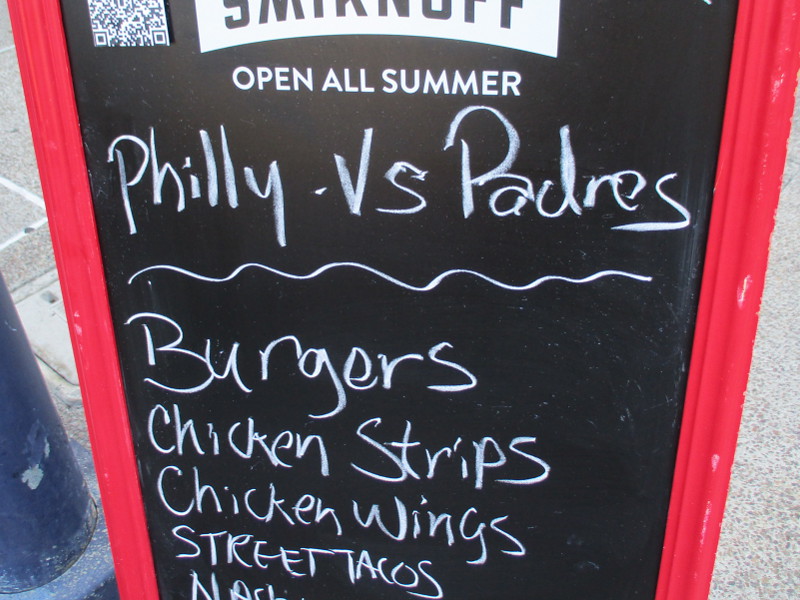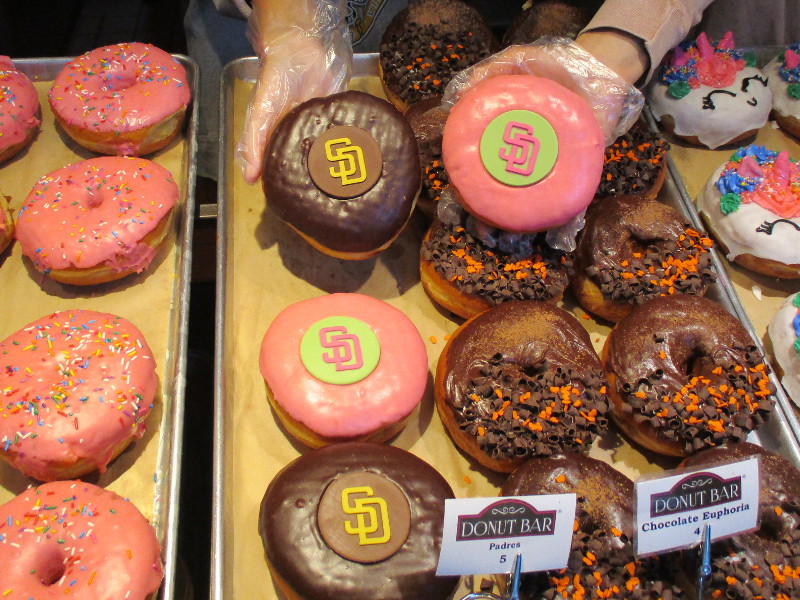 Lots of video production trucks are now parked on two sides of Petco Park.NLCS graphics were up on one of Petco Park’s big videoboards.City workers were repainting stripes on the street near Petco Park.Those barricade “planter boxes” near the Harbor Drive pedestrian bridge have recently been painted with orange, brown and yellow. Together they spell P A D R E S.Nearby shops, bars and restaurants are welcoming baseball fans.The Gaslamp Quarter has these Capture the Moment banners.Transit buses everywhere root for our Padres!The Donut Bar has these yummy Padres doughnuts!I hope this place has the game on!A television news cameraman stands by near Petco Park.And this cool guy gave me a thumbs up!