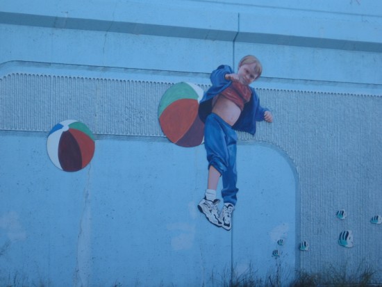 This is a part of a very long mural decorating the north side of Interstate 8 in Mission Valley. It’s called Kids being Kids.